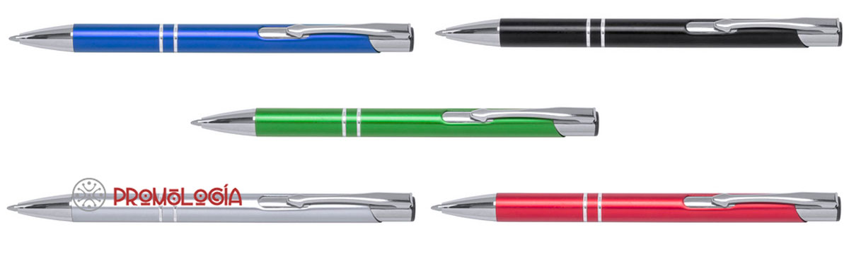 Bolígrafo para publicidad de aluminio, con carga Jumbo, lacado en 5 colores para elegir: plata, verde, azul, rojo y negro. Largo 13,7, diámetro 1 cm. Peso 14 grs. Personalizado en tampografía en el cuerpo del bolígrafo. Posible la impresión en láser.