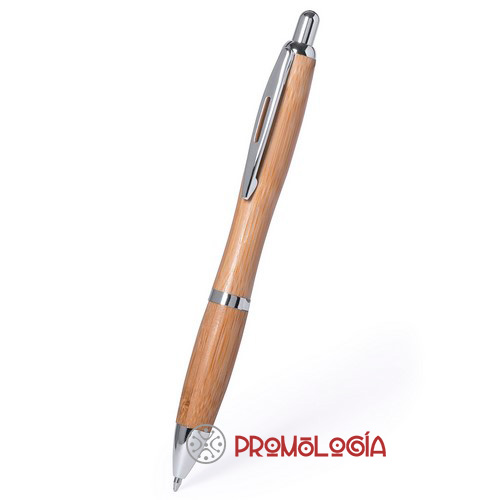Elegante bolígrafo de mecanismo pulsador con cuerpo en madera de bambú natural, accesorios de acabado metálico en color plateado brillante y clip troquelado. De cartucho jumbo y tinta azul. Impresión en tampografía, consultar para láser.