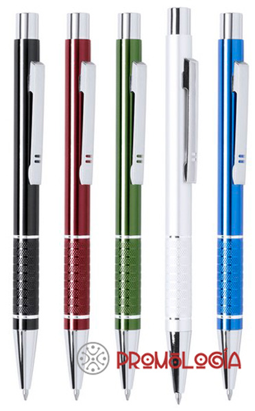 Elegante bolígrafo de aluminio con mecanismo pulsador en variada gama de vivos colores metalizados y accesorios en color plateado. Con original clip troquelado y empuñadura antideslizante. Tinta azul. Medida y Peso Articulo: 14,2 cm   |  Ø 1   |  14 gr.