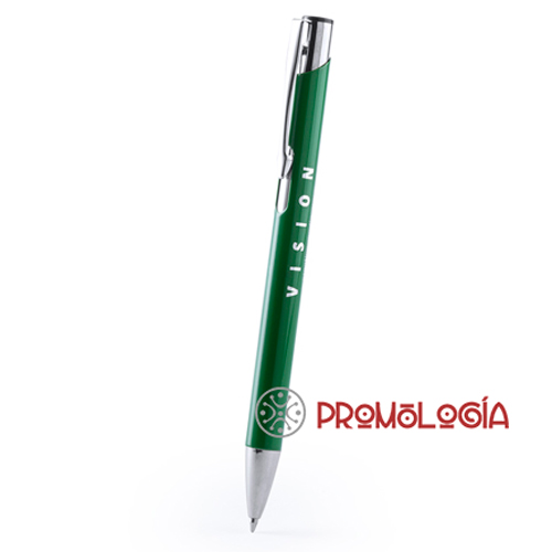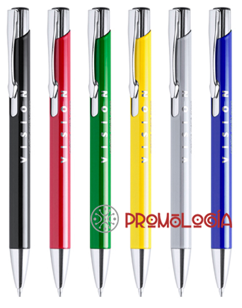 Desenfadado bolígrafo de aluminio con mecanismo pulsador en variada gama de vivos colores. Accesorios en color plateado brillante y original cuerpo troquelado. Especialmente diseñado para marcaje en láser y con un recubrimiento exterior especial para que tu publicidad quede perfectamente grabada en color plateado brillante, a juego con el resto de accesorios del bolígrafo. Cartucho jumbo y tinta azul.