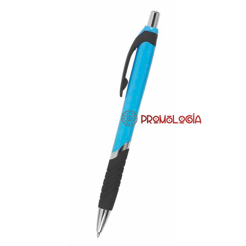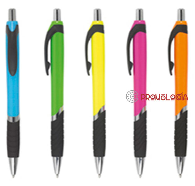 Bolígrafo promocional de plástico, con apertura por pulsador, clip. Disponible con cuerpo en 5 colores y detalles en negro y plata. La impresión se realiza en tampografía. También se sirven surtidos.