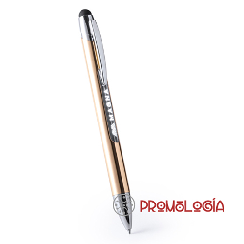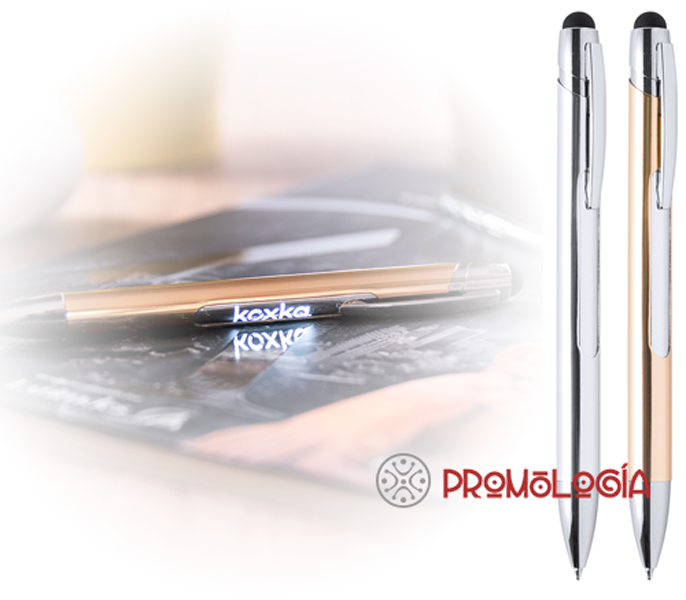 Bolígrafo puntero led de mecanismo pulsador con interior iluminado y cuerpo en aluminio de suave acabado cromado. Área de marcaje especialmente diseñada para grabación en láser y así conseguir que tu publicidad o marca quede originalmente iluminada con luz blanca. En colores plateado y dorado. 1 led, pilas de botón incluidas y tinta azul.