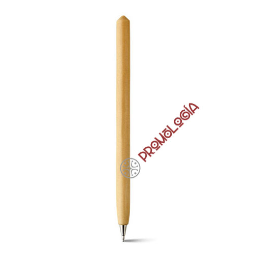 Bolígrafo con cuerpo de madera y pequeña tapa de plástico transparente que solo cubre la punta.
