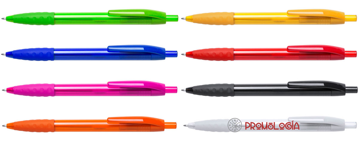 Bolígrafo publicitario de plástico, de 13,8 cm. de largo y 1 de diámetro, con un peso de 7 grs. Con apertura por pulsador, agarrador de caucho (para una escritura confortable) y cuerpo transparente. Se fabrica en ocho colores que pueden ser elegidos de 50 en 50 unidades de cada. Personalización en tampografía sobre el cuerpo.
