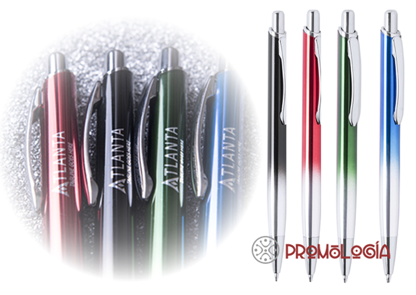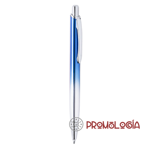 Atrevido bolígrafo de aluminio metalizado con mecanismo pulsador y detalles en color plateado. Cuerpo en combinación de llamativos colores degradados con tonos plateados brillantes. Especialmente diseñado para marcaje en láser y con un recubrimiento exterior especial para que tu publicidad quede perfectamente grabada en color plateado brillante, a juego con el resto de accesorios del bolígrafo. Tinta azul.