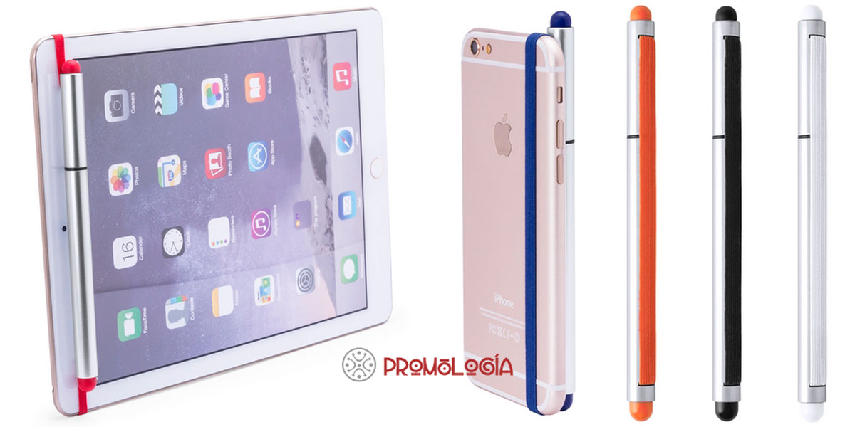Bolígrafo touch con dos punteros y cinta elástica para sujetarlo a u móvil o un cuaderno. Con capuchón y carga Jumbo. La impresión se realiza en tampografía en el capuchón (recomendado) o en el cuerpo del bolígrafo. Tamaño: 14, 7 x Ø 1, peso 8 grs. Cuerpo plateado con punteros y cinta en 5 colores a escoger en múltiplos de 50 unidades.