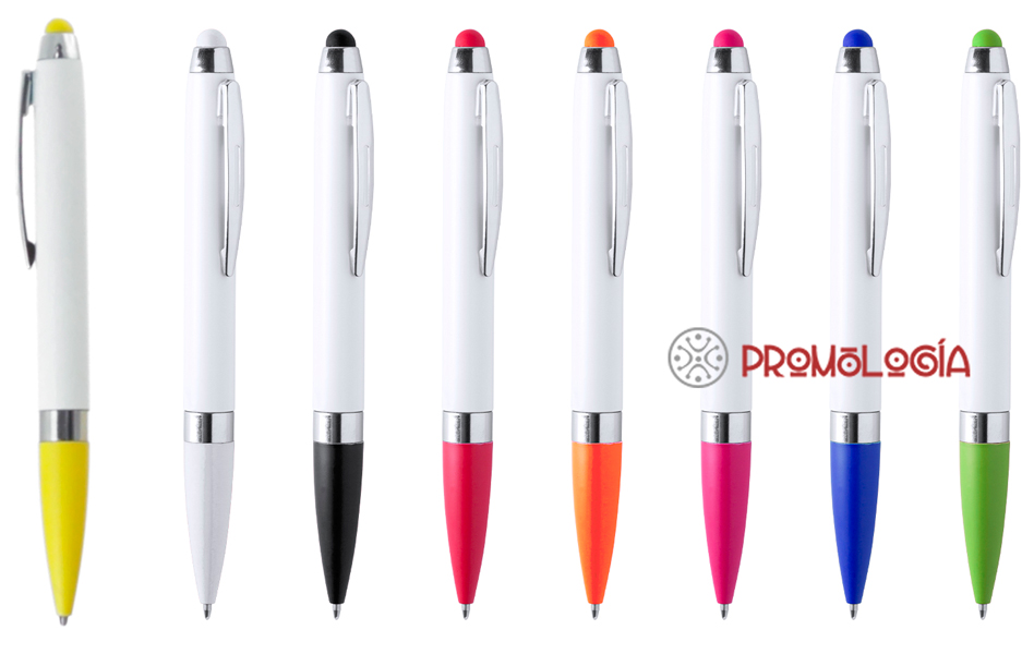 Bolígrafo puntero de colorido diseño, con cuerpo en elegante color blanco sólido. Empuñadura y puntero a juego, con detalles cromados. Tinta azul.