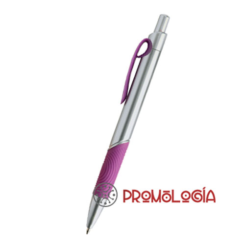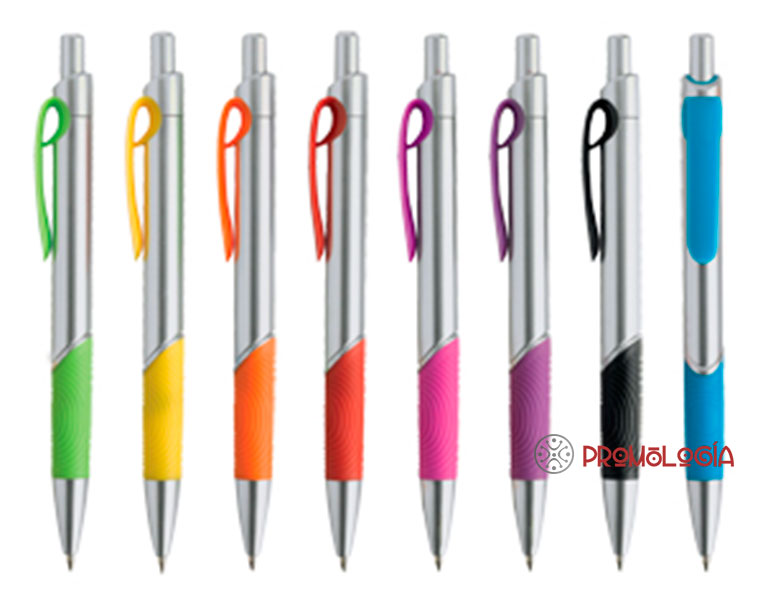 Bolígrafo promocional de plástico, con apertura por pulsador. Disponible con los detalles en 8 colores y cuerpo en plata. La impresión se realiza en tampografía.