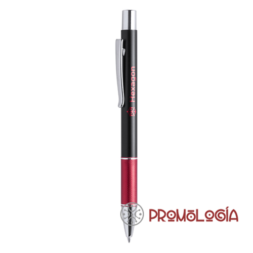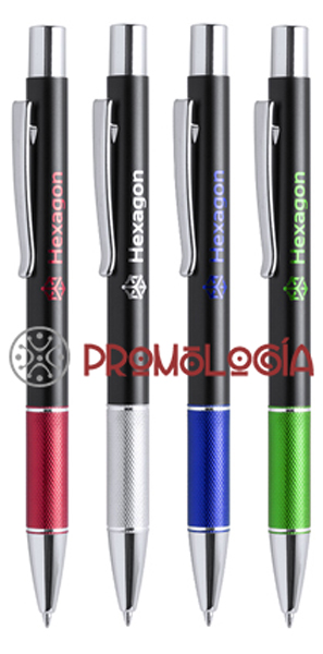 Bolígrafo de mecanismo pulsador con cuerpo de aluminio, acabado sólido en color negro y empuñadura en variada gama de colores metalizados de acabado brillante. Clip metálico en color plateado brillante. Especialmente diseñado para marcaje en láser y con un recubrimiento exterior especial para que tu publicidad quede perfectamente grabada, a juego con el color de la empuñadura. Tinta azul.