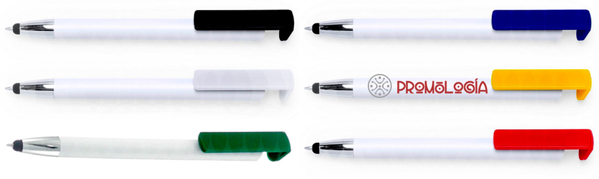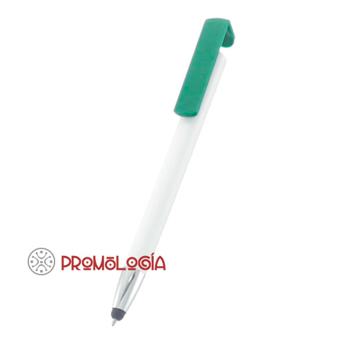 Bolígrafo touch con soporte para móvil, con carga Jumbo, peso 10 gr. y 14 cm. de largo por 1,1 de diámetro. Cuerpo blanco con puntera color plata y clip de colores a elegir entre verde, azul, amarillo, negro, blanco o rojo (múltiplos de 50 unidades) Personalizado por tampografía en cuerpo o clip.