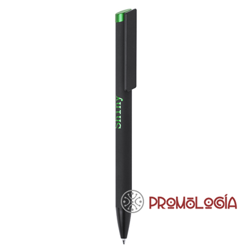 Bolígrafo de mecanismo pulsador con cuerpo de acabado sólido en color negro y anilla superior en variada gama de colores metalizados de acabado mate. Clip en color negro con amplia superficie de impresión. Especialmente diseñado para marcaje en láser y con un recubrimiento exterior especial para que tu publicidad quede perfectamente grabada, a juego con el color de la anilla superior. Cartucho jumbo y tinta azul.