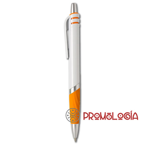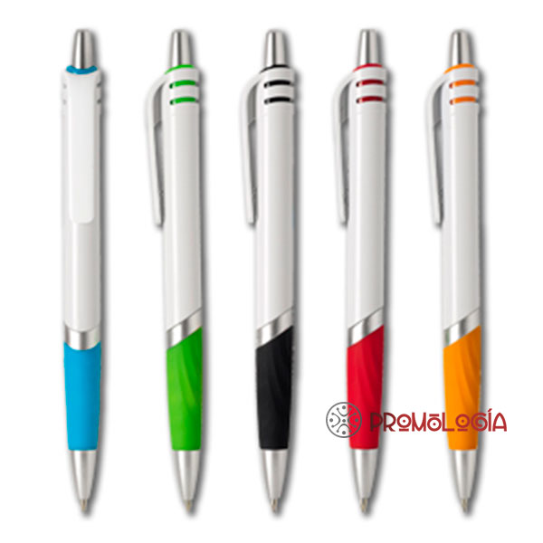 Bolígrafo promocional de plástico, con apertura por pulsador. Disponible con los detalles en 5 colores, con cuerpo blanco y puntera y pulsador en plata. La impresión se realiza en tampografía.