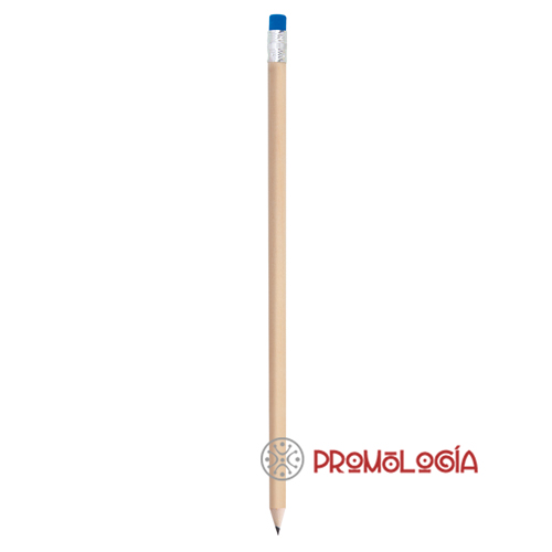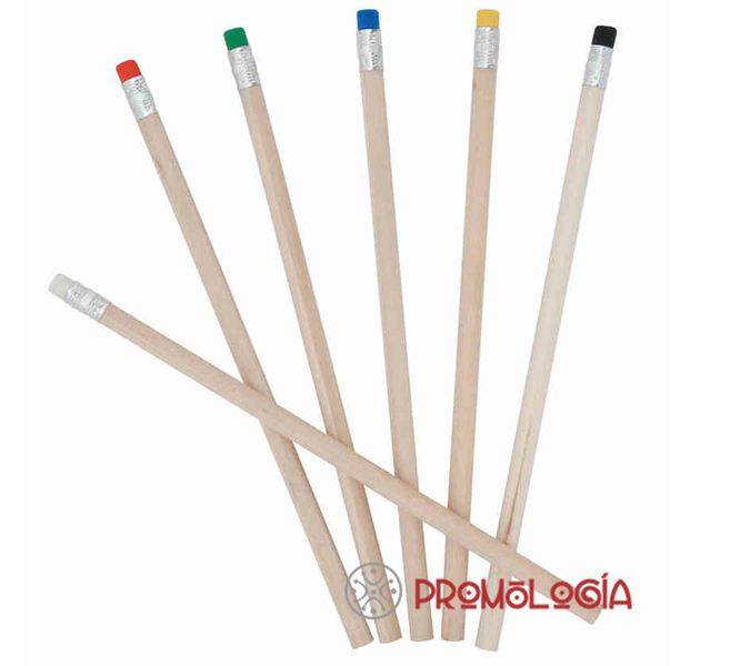 Lápiz promocional de madera con cuerpo redondo en acabado natural y con goma de borrar en divertidos y variados colores. Medidas: 19cm | 0.7 Ø | 5 gr.